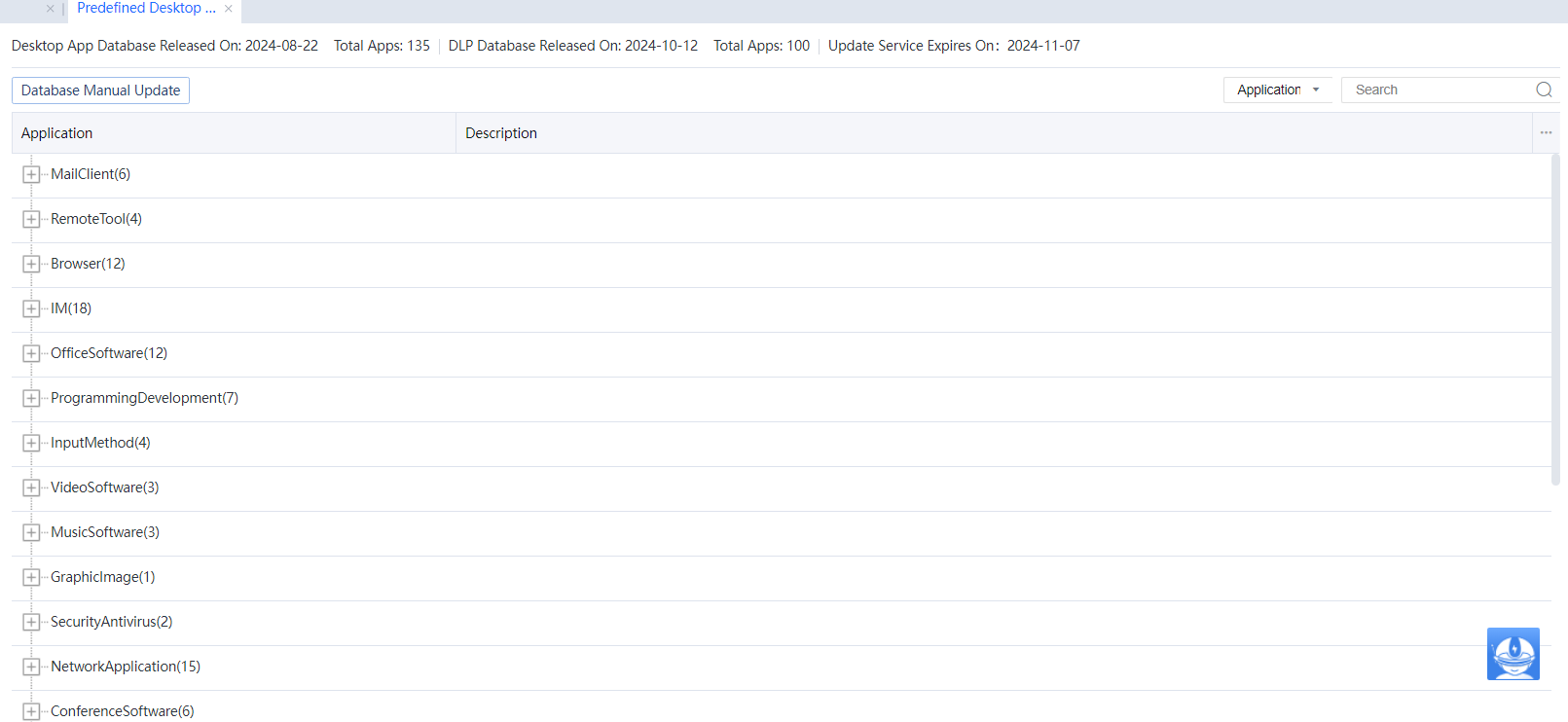 You can go to System > Objects > Desktop App Database > Predefined DesktopApps to view all the predefined applications that can be identified by the current IAG device. To update predefined applications, make sure that you have obtained the corresponding license. To check whether the license is valid, go to System > General > Licensing to view the licensing status of Application Signature Database. If the license is within the validity period and the network connection of your device is normal, the predefined applications can be regularly updated online to the newest.