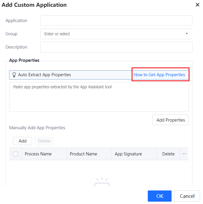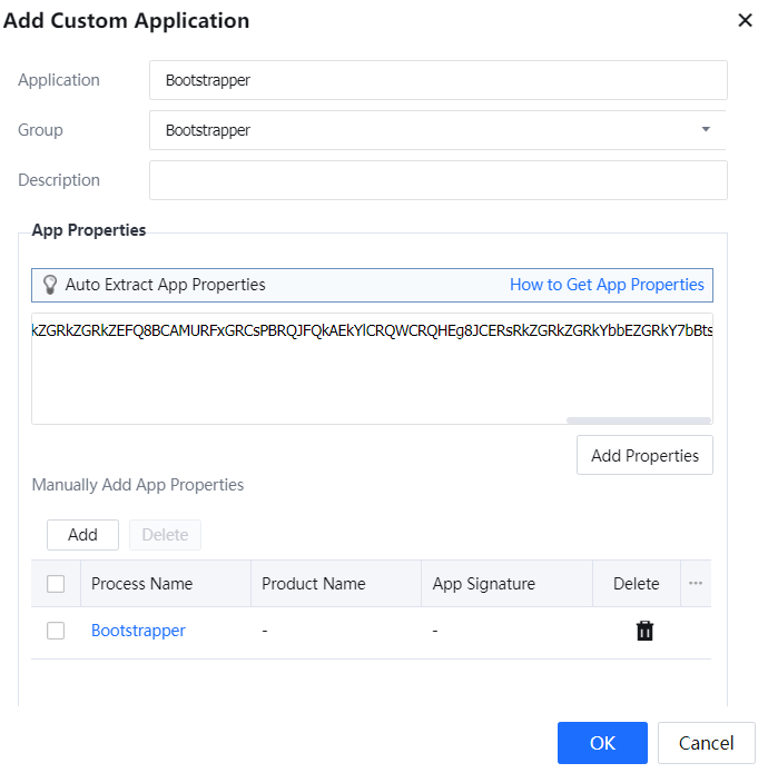 Step 3.Switch back to the Add Custom Application dialog box, specify Application, Group, and Description as needed, click Add Properties to add the identified application properties with one click, and click OK. The custom application is successfully added.