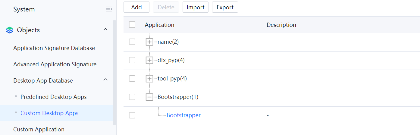 You can go to System > Objects > Desktop App Database > Custom Desktop Apps to add custom endpoint applications that are not included in the predefined applications.
