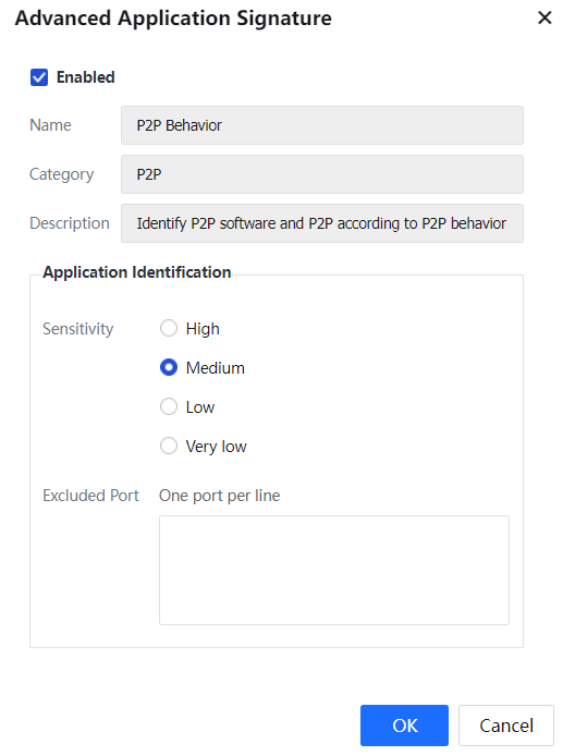 In Excluded Port, set one or more ports to be excluded from scanning. If the destination port of data is an exclusion port, the device will not perform P2P identification for the data.