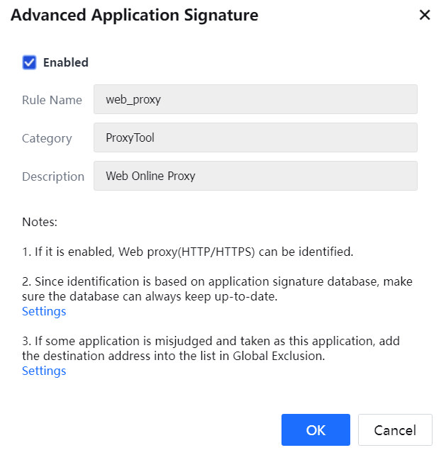 Web online proxy identification rules can be edited. Click Web Online Proxy to display the rule editing dialog box.