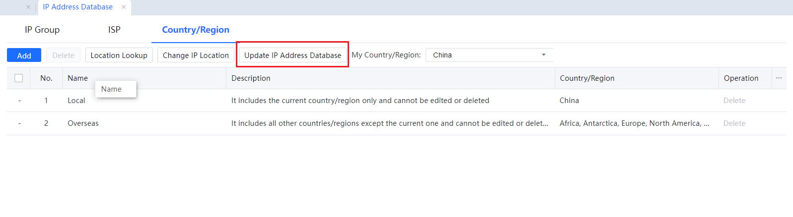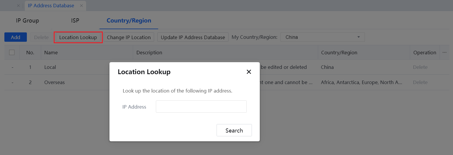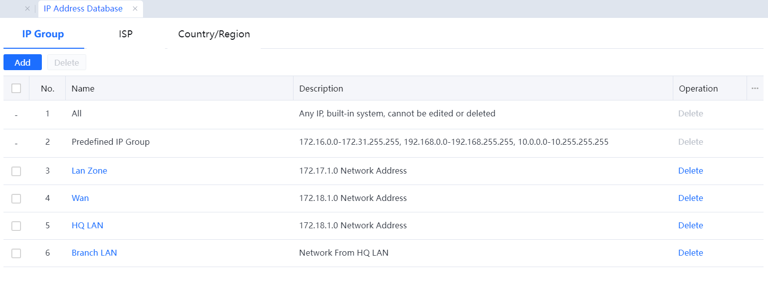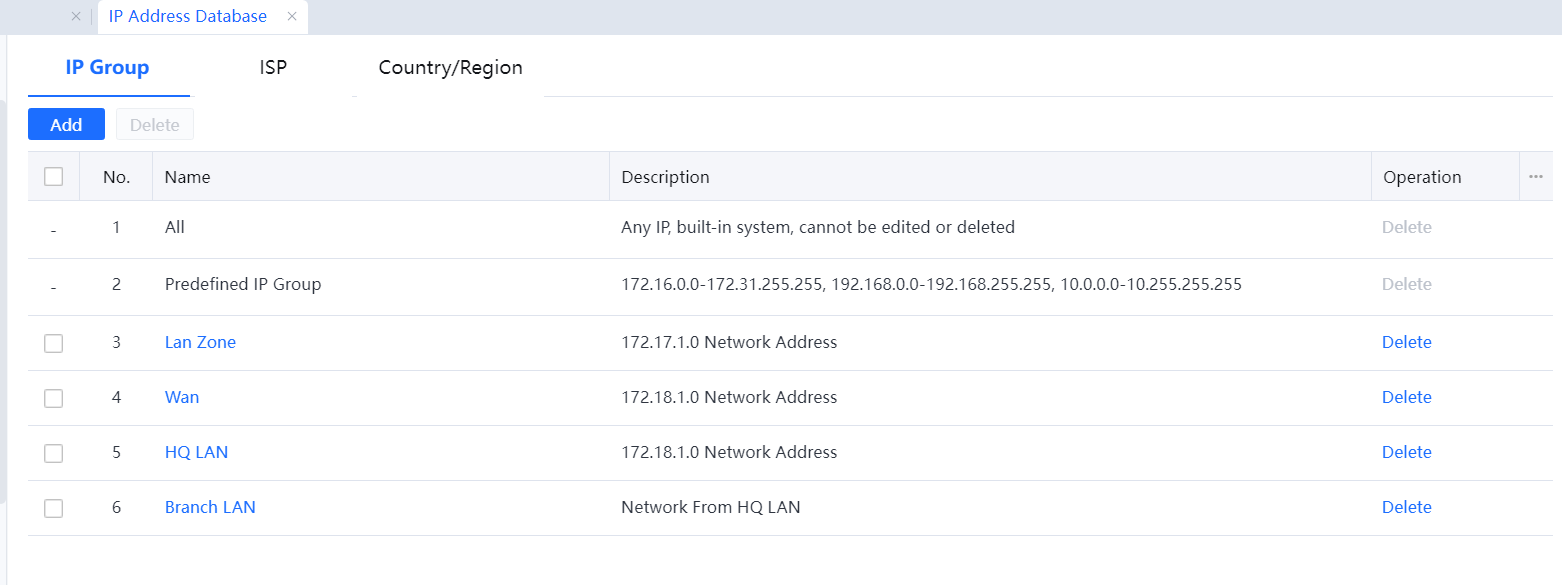 Click Delete to delete the selected Internet service provider (ISP) address library.