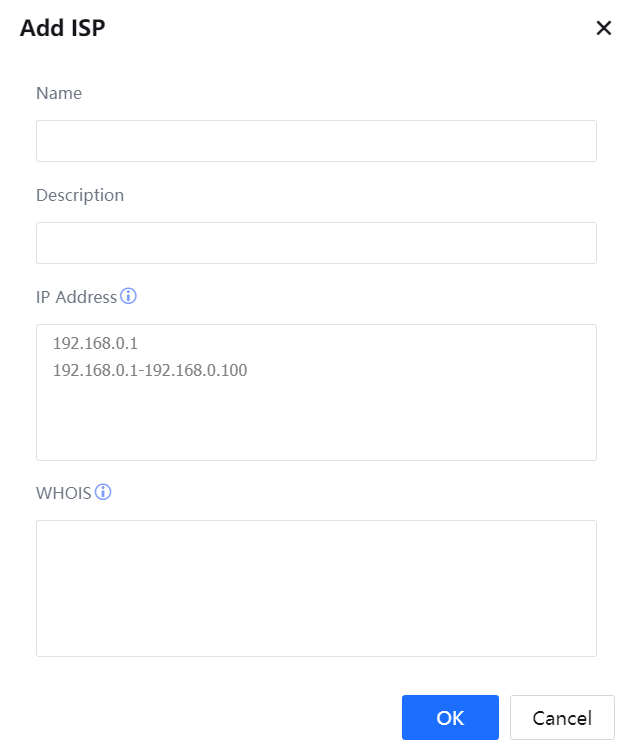 On the ISP page, you can set the IP address segment of the network carrier. This IP address segment is invoked during multiline routing in policy-based routing.