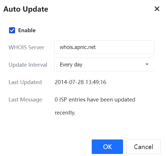 Auto Update: Specifies whether to update the ISP address library automatically. Automatic update is enabled by default.