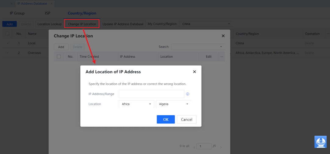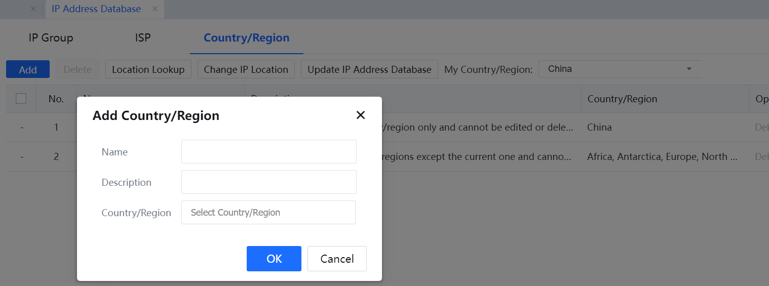 - From the Navigation bar, select IP Address Database and click the Country/Region tab. Create a new customs area as below.