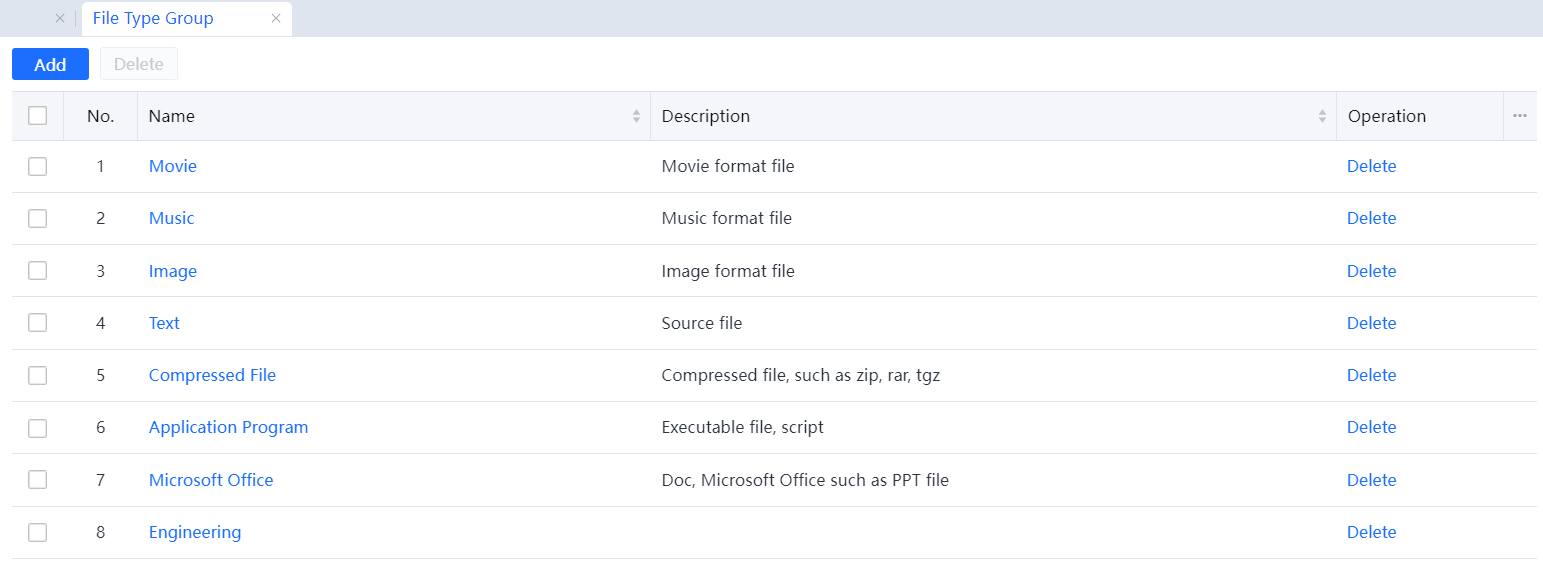 Click Add. The Add File Type Group window is displayed, as shown in the following figure.