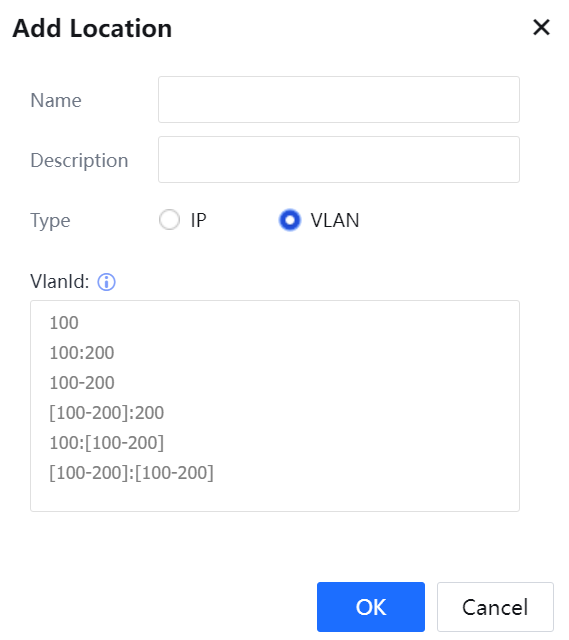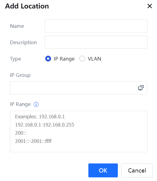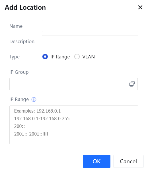 Type: Specifies the location group type, which can be set to IP Range, or VLAN.