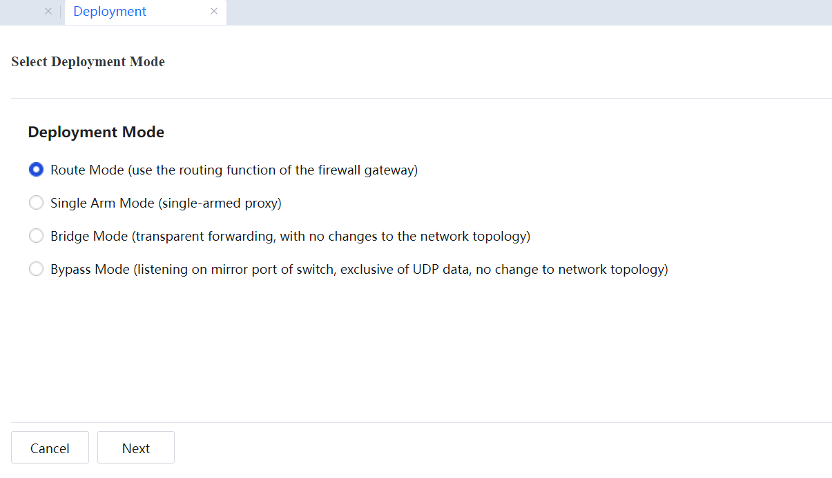 - Navigate to System > Network > Deployment. On the Deployment pane on the right, click Settings. Then, select Route Mode and click Next.