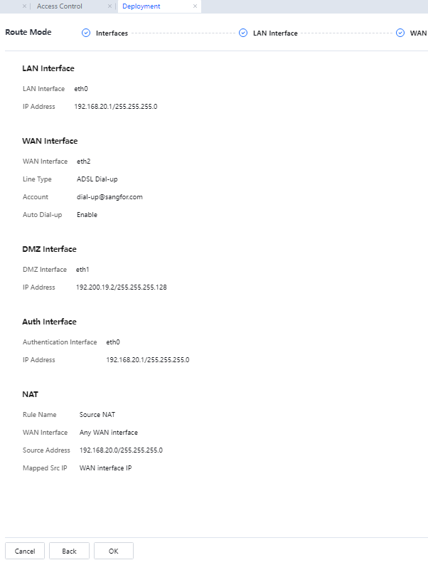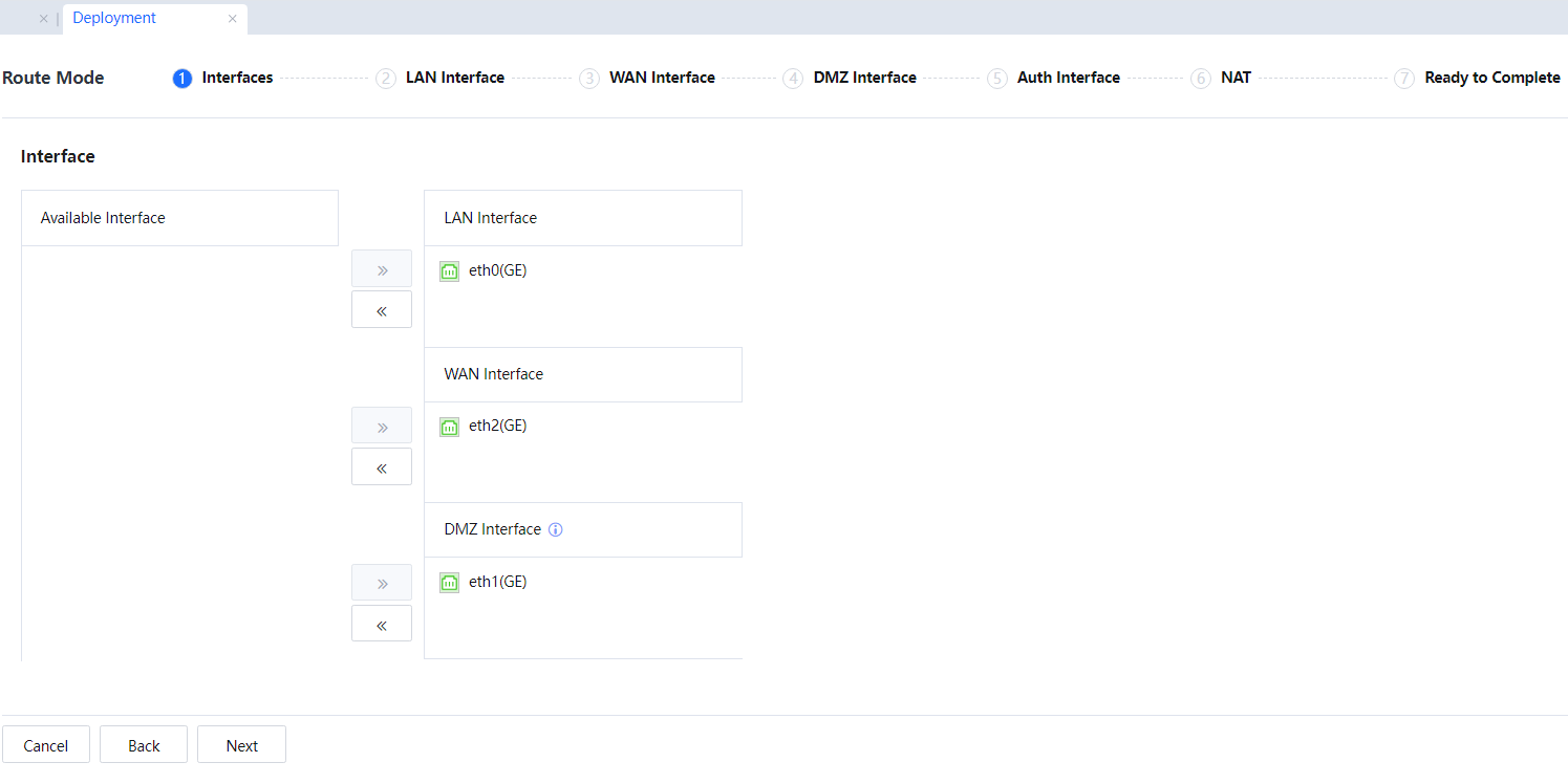 The default LAN interface is eth0, the default DMZ interface is eth1, and the default WAN interface is eth2. It is recommended that the positions of these network interfaces not be modified and conform to the device panel.