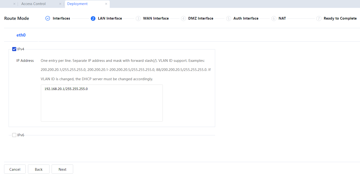In this example, set the IP address of LAN interface eth0 to 192.168.20.1/255.255.255.0.