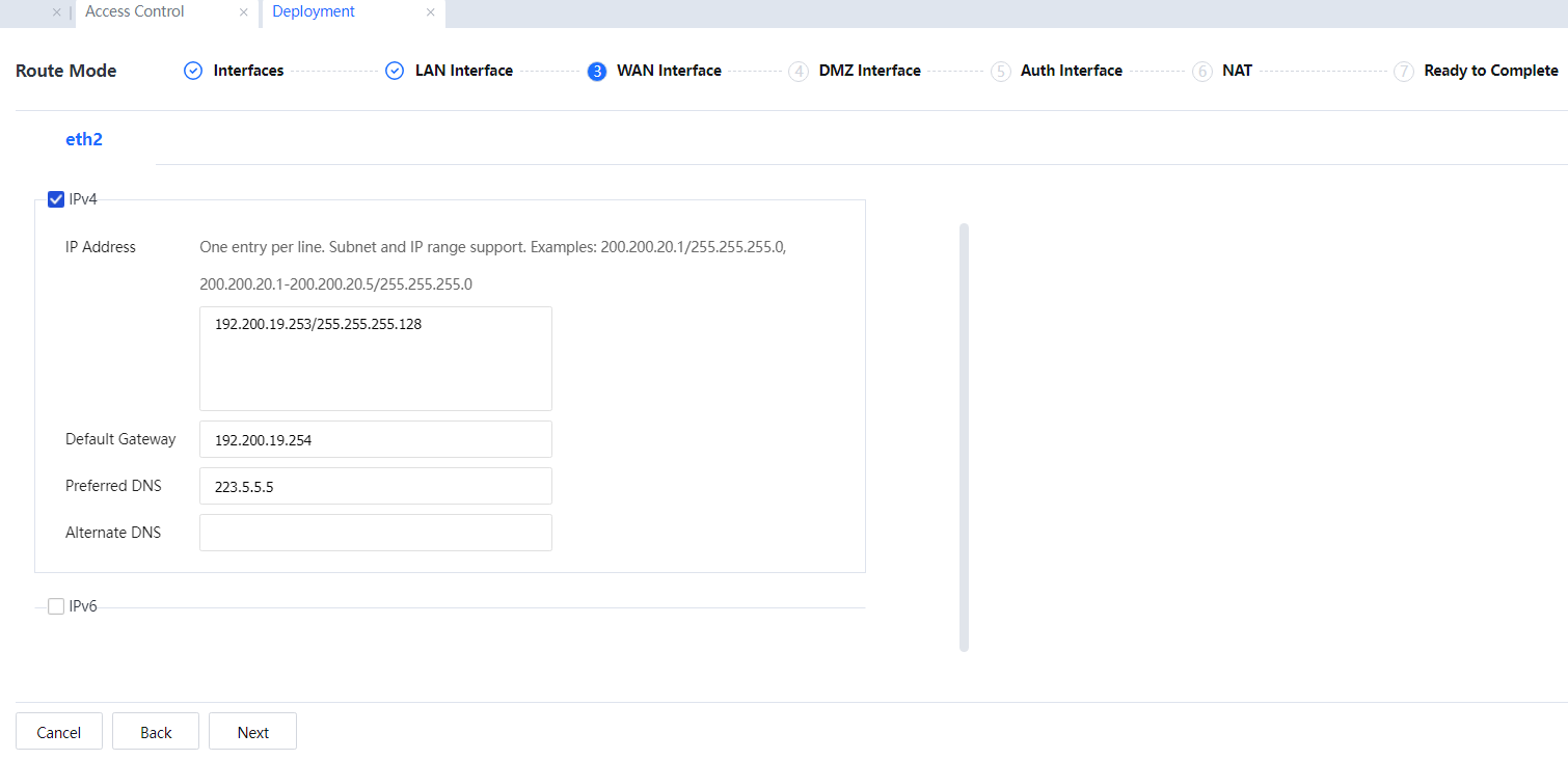 6. If a front-end device is configured, set the IP address of the WAN interface to be on the same network segment as the IP address of the LAN interface of the front-end device. Other operations are the same.