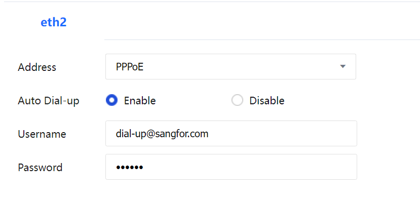 If PPPoE is employed, connect the WAN interface to a modem. If Enable is selected in Auto Dial-up, automatic dialup will be performed after the connection line is disconnected abnormally or the device is restarted. Enter the dialup account and password.