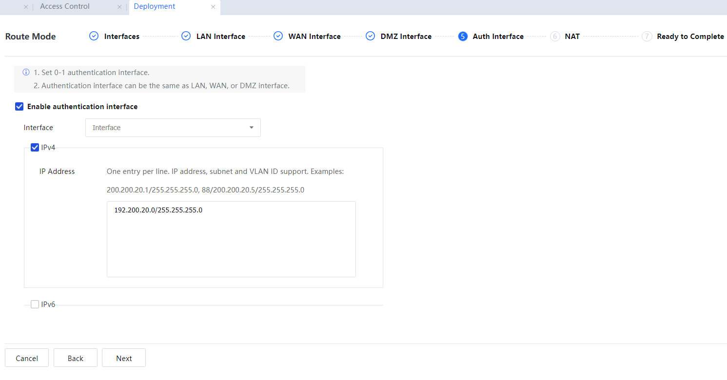 WAN interface list: A network interface added to the WAN interface list serves as a WAN interface and needs to be connected to the external network. If multiple WAN interfaces are required, apply for multi-line authorization.