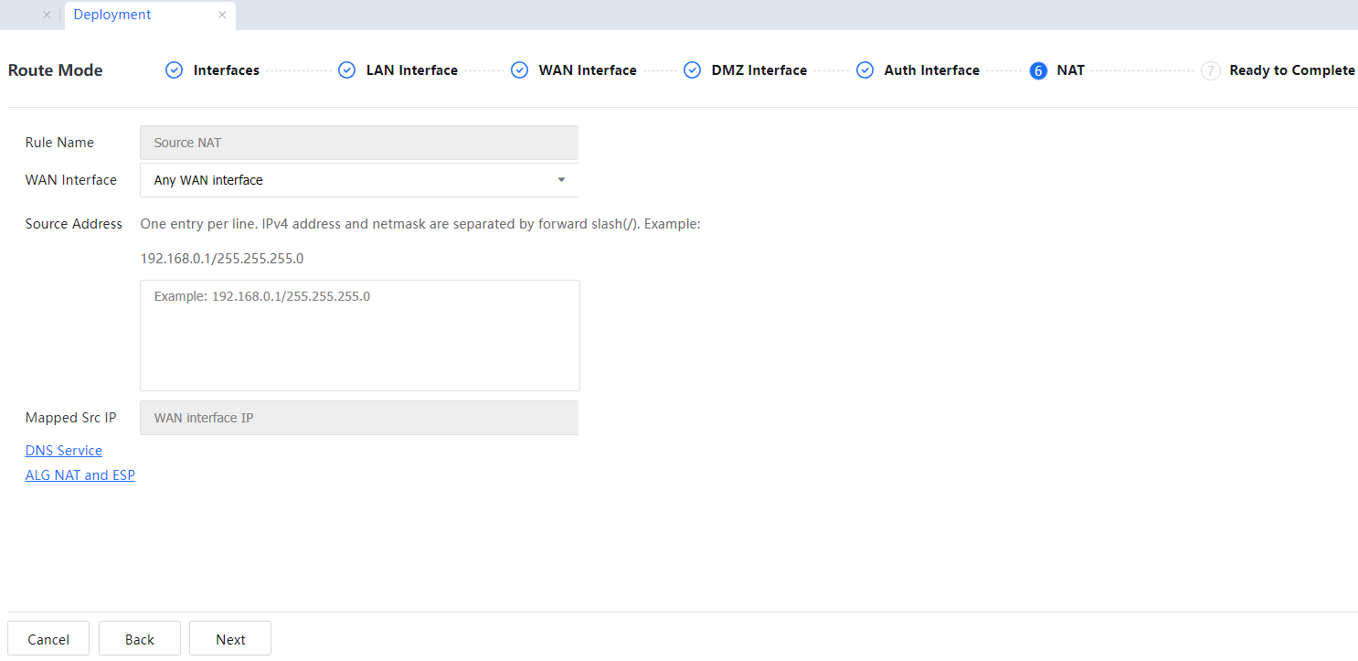 - Configure IPv4 SNAT rules. When the device functions as a gateway and directly connects to the public network line, proxy settings must be completed to implement Internet access for intranet users. Set the proxy network segment and select a WAN interface, which can be set to a single or all network interface in the WAN interface list.