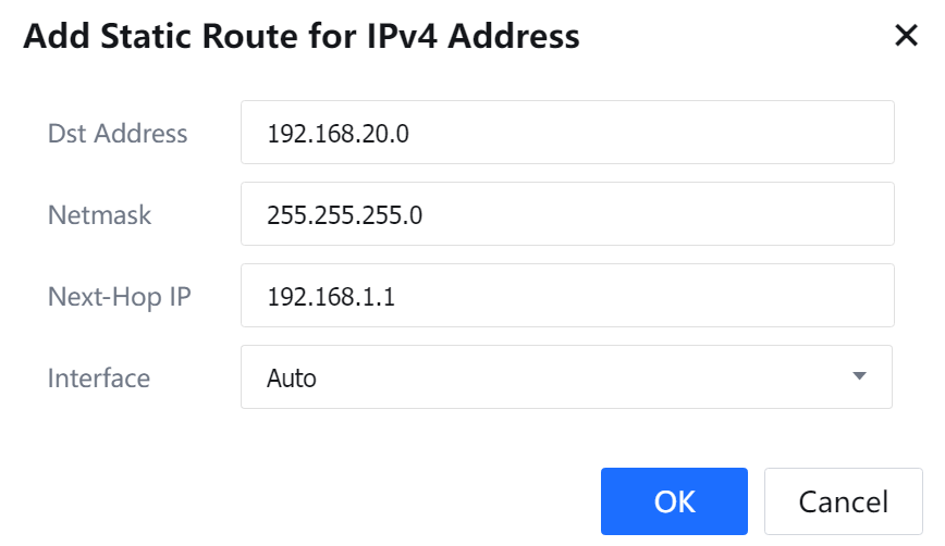- In this example, the LAN interface and the intranet are not on the same network segment. Therefore, a system route from the device to the intranet needs to be added. Navigate to Network > Static Routes. Click Add to add routes on the Static Routes pane on the right. If the intranet covers multiple network segments, add multiple system routes.