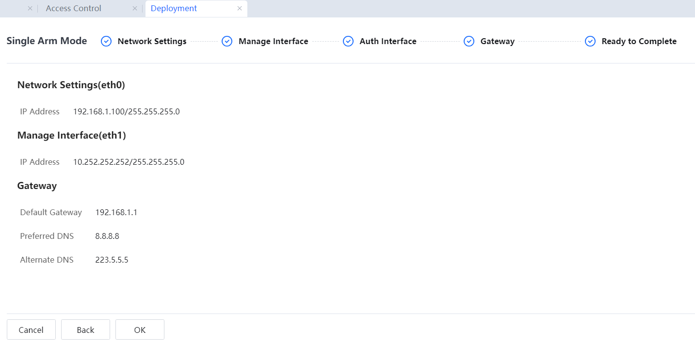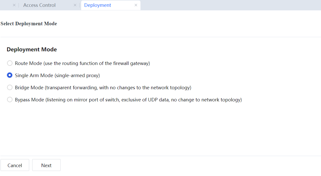 Navigate to System > Network > Deployment page. Click Settings, select Single Arm Mode, and click Next.