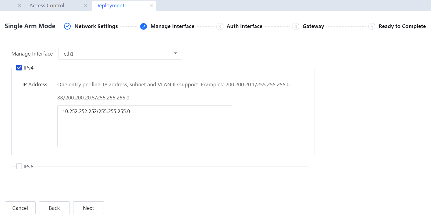 Select an available interface as Manage Interface and configure an IPv4 address for the interface (an IPv6 address is also supported). The Default Mange interface is eth1, through which users can connect to this unit. After configuring the Manage interface, click Next.