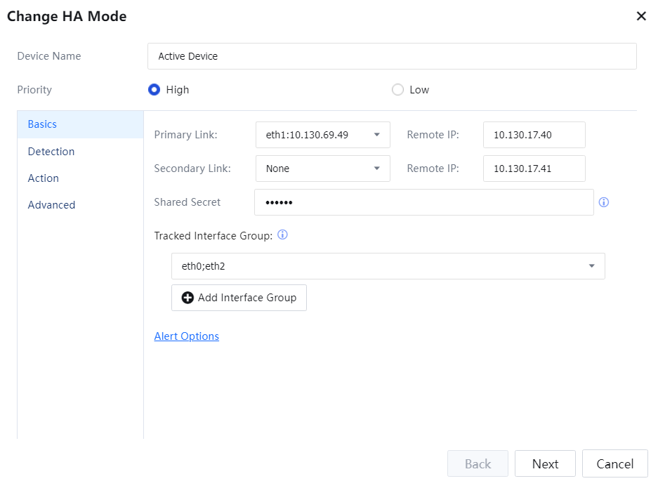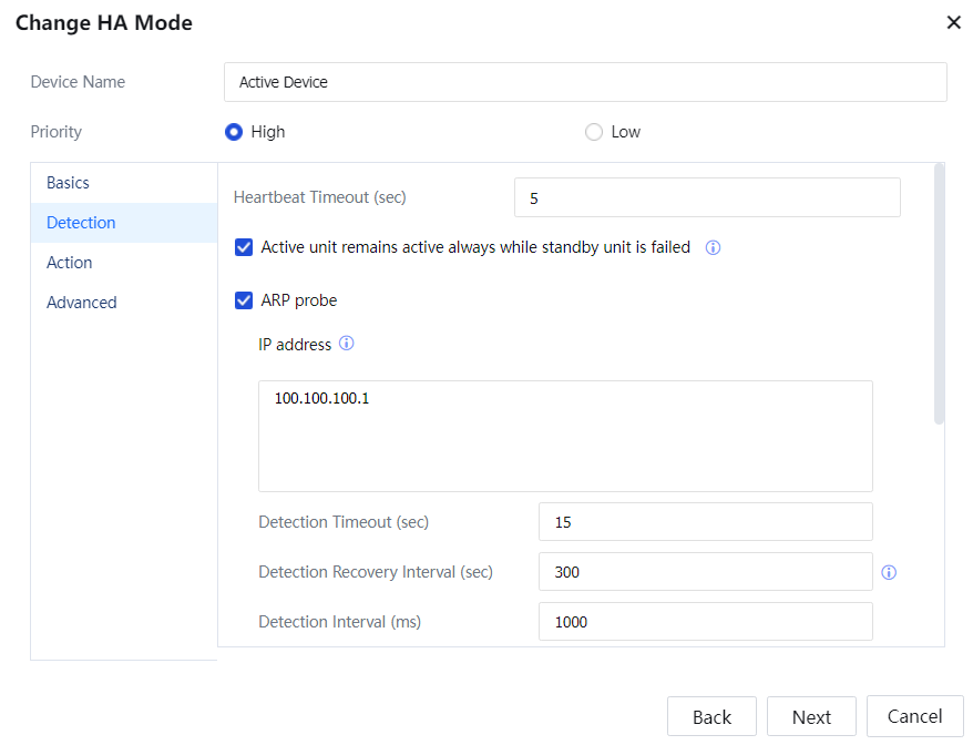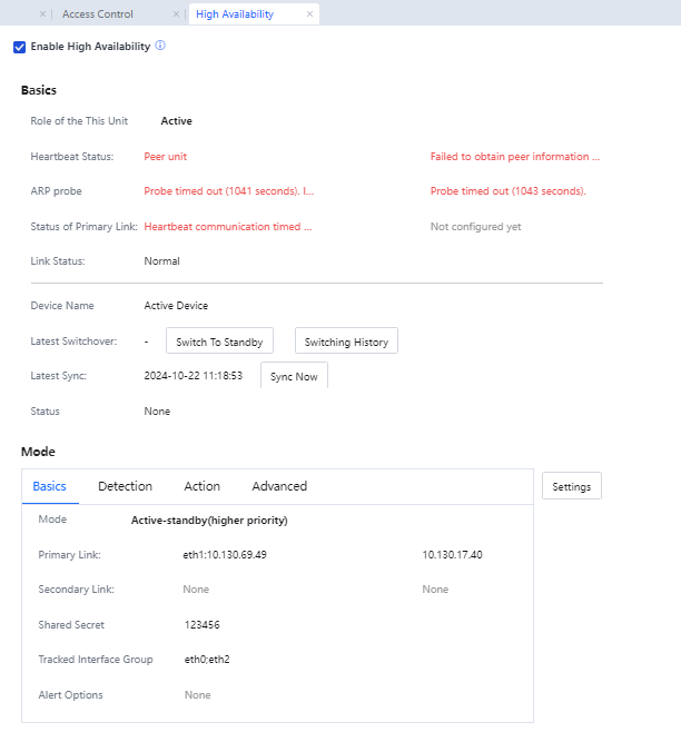 - Select the Active-Standby mode and set related parameters. Navigate to System > Network > High Availability. See the following figure.