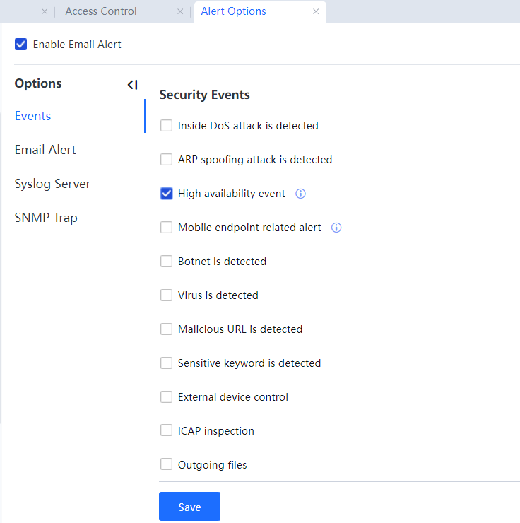 Alert options: Click Alert options, and you will be redirected to the email alarm events page and select the High Availability event, as shown in the following figure.