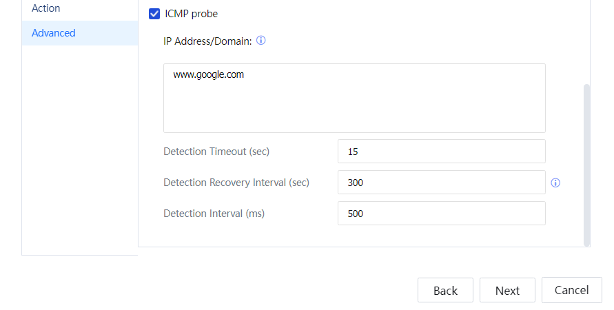 ICMP detection mainly detects the connectivity of the filled host IP or domain name. The probe IP/domain name can support multiple entries. Only when all IP or domain name detection fails the ICMP detection fails The ICMP detection can set the detection timeout, the detection recovery interval, and the detection interval.