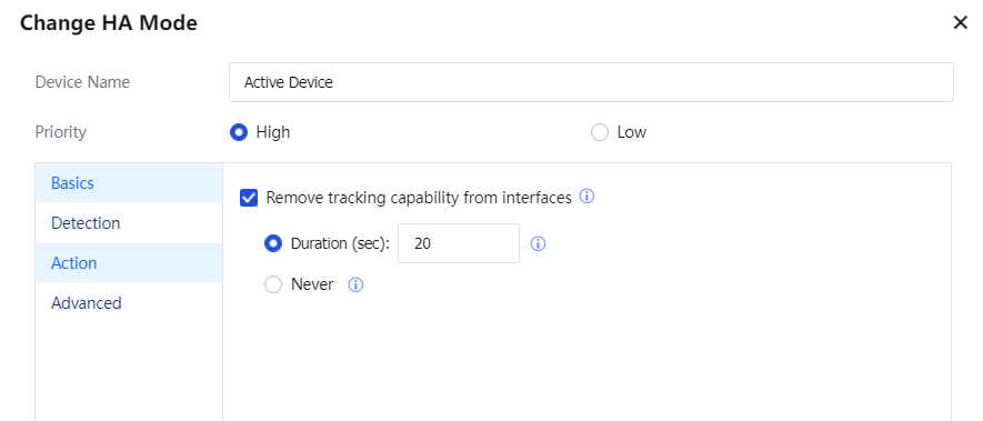 Remove tracking capability from interfaces: This feature is not selected by default. When the device enters standby, all interfaces in the monitoring interfaces group are disabled. The device is used to notify the device to switch between uplink and downlink devices.
