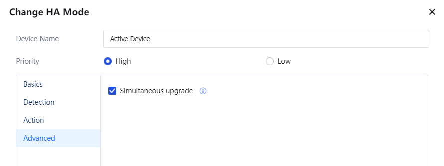 - In Advanced, select Simultaneous Update to update the standby unit as well when the active unit is being upgraded(available for Active-standby mode of version 12.0.14 or higher).