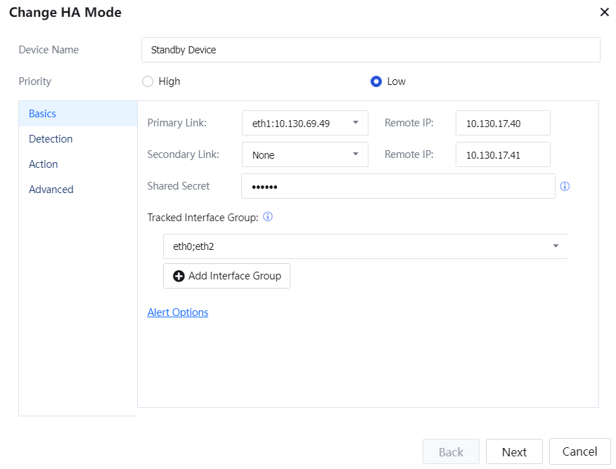 After Low has been selected on the priority of the standby device. The configuration method is the same as the active device. Please note that the standby device's priority is different from the active device. The primary link of the standby device needs to write the address of the active device. The Detection and Action refer to the active device configuration.