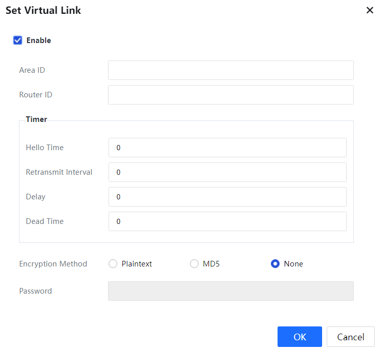 Router ID: Enter the router ID on the opposite endpoint establishing the virtual link to indicate which router the virtual link is established.