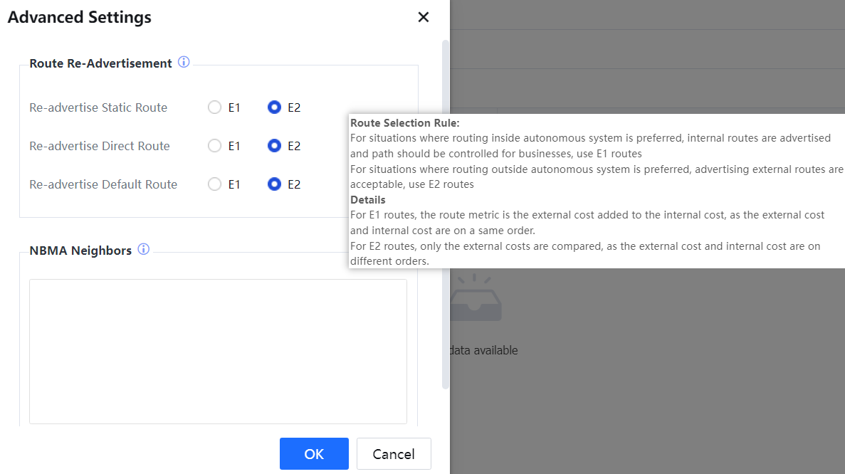 Click Advanced[A251] to set up the route redistribution and NBMA neighbor configuration, as shown in the following figure: