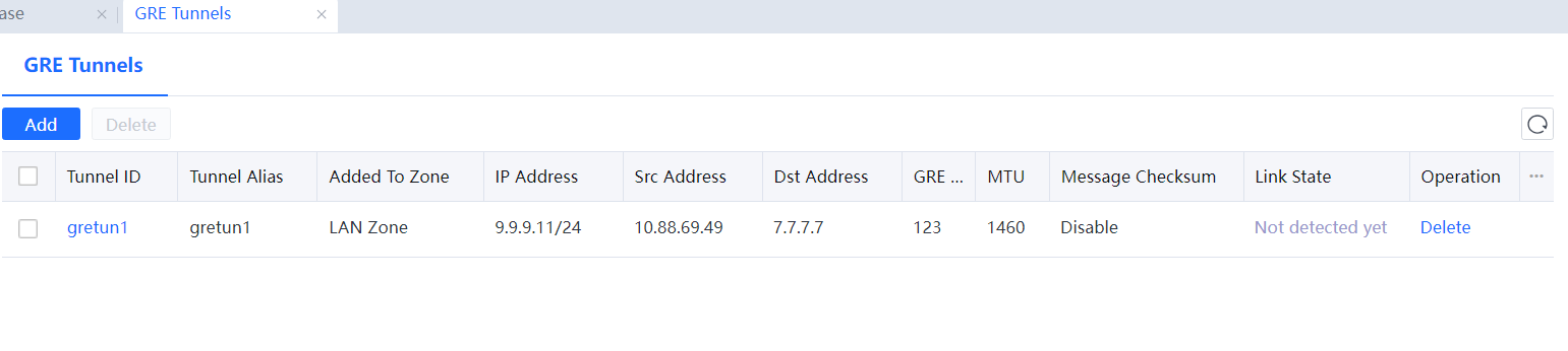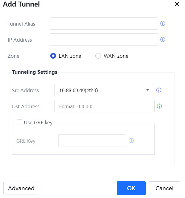 GRE Tunnel: Used to configure GRE Tunnel and support GRE OVER IP, GRE OVER OSPF, and GRE OVER IPSEC VPN. The settings interface is shown below: