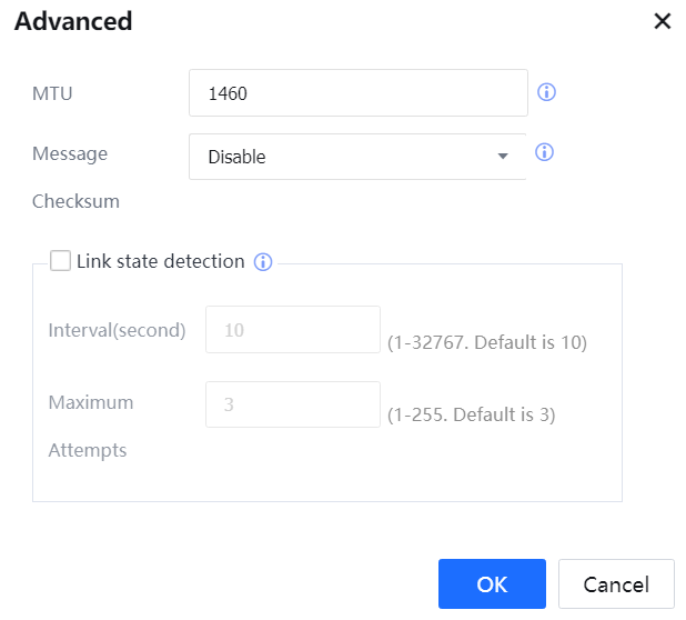 Advanced: Set MTU value, message check, and link-status check, shown as follows: