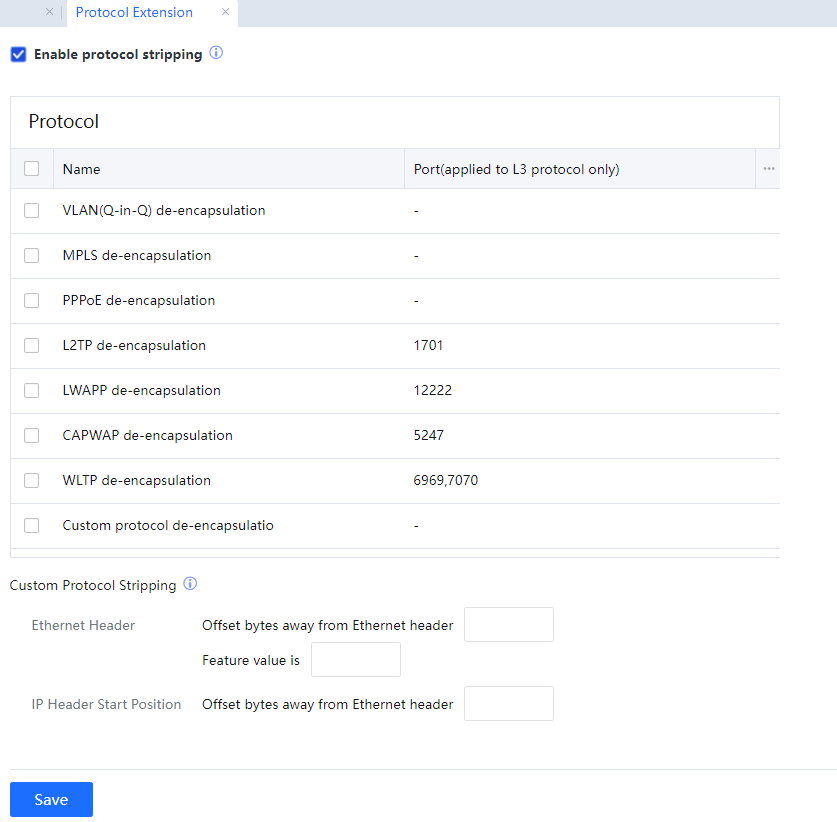 Currently, the Sangfor IAG can peel off packet headers of the following protocols: VLAN, MPLS, PPPoE, L2TP, LWAPP, CAPWAP, WLTP, and user-defined protocols.