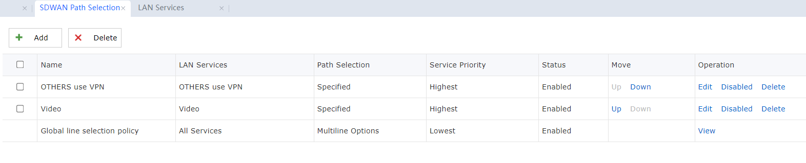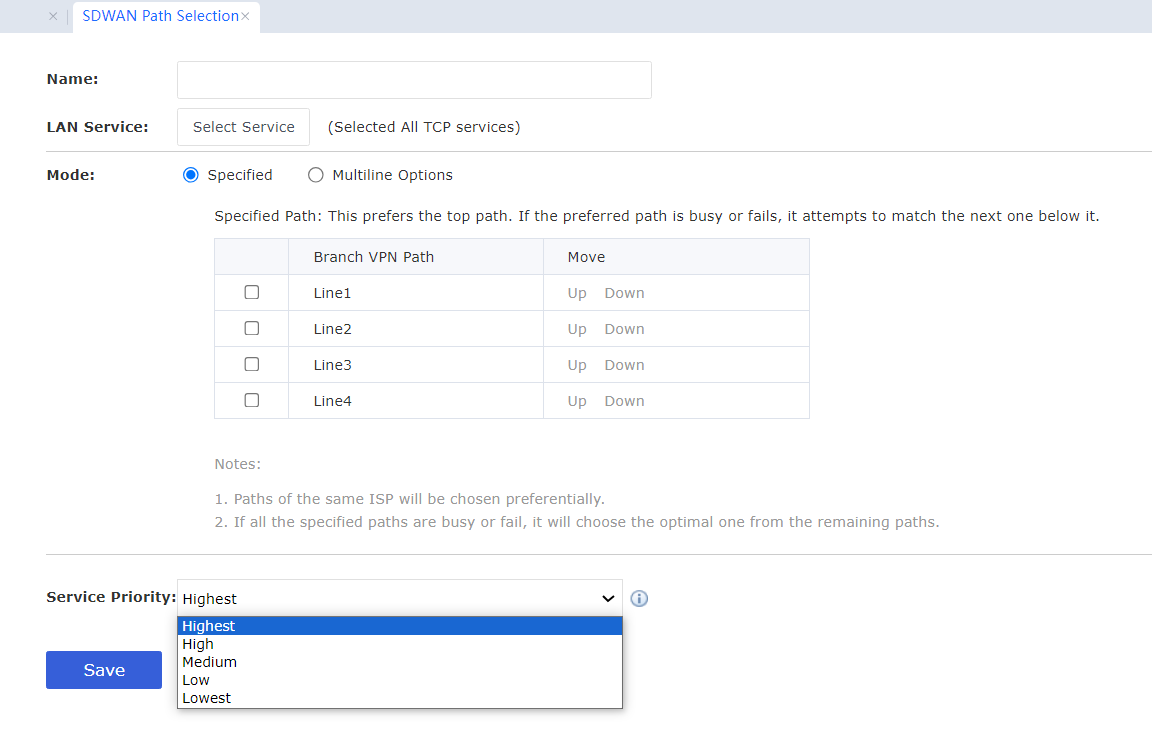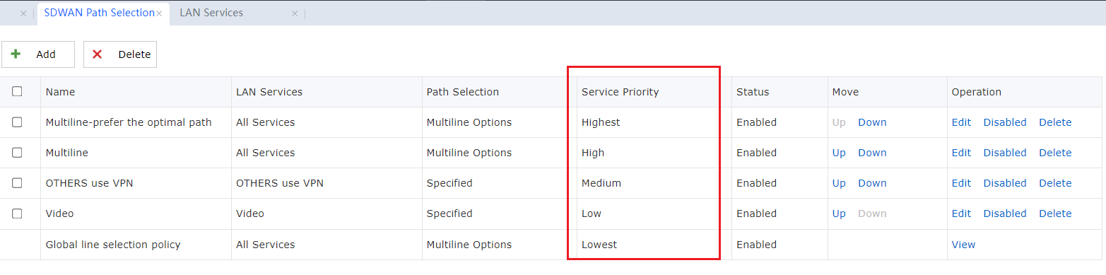 Under the SDWAN Path Selection, the service priority is classified into five levels: Highest, High, Medium, Low, and Lowest. SDWAN performs traffic control (QoS priority) on data through service priority.