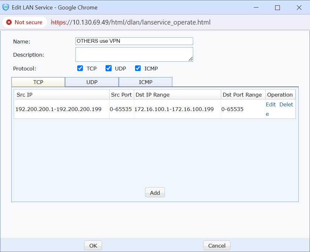 - Add the OTHERS use VPN under the Advanced> Edit LAN Service, and select all services.