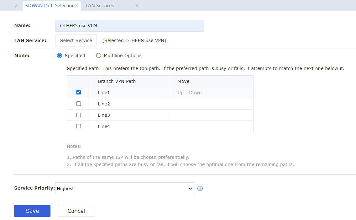 - Select the Specified path selection mode. Select the Line 1 for VPN Path. Next, select the OTHERS use VPN.