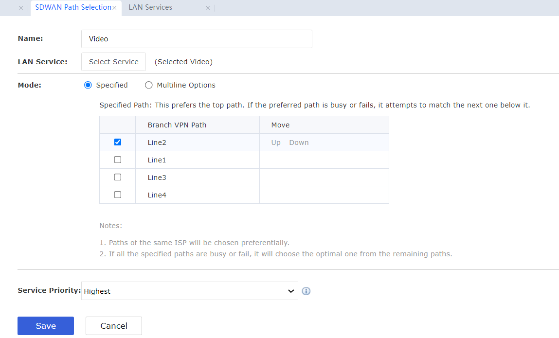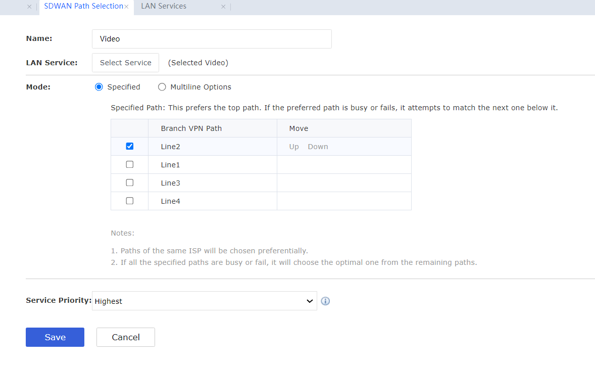 - Create an SDWAN policy Video. Select the Selected Video for LAN Service. Select Specified for the Mode. Select the specified path.