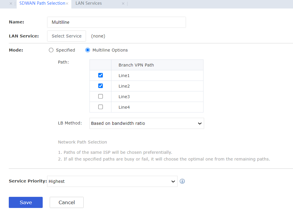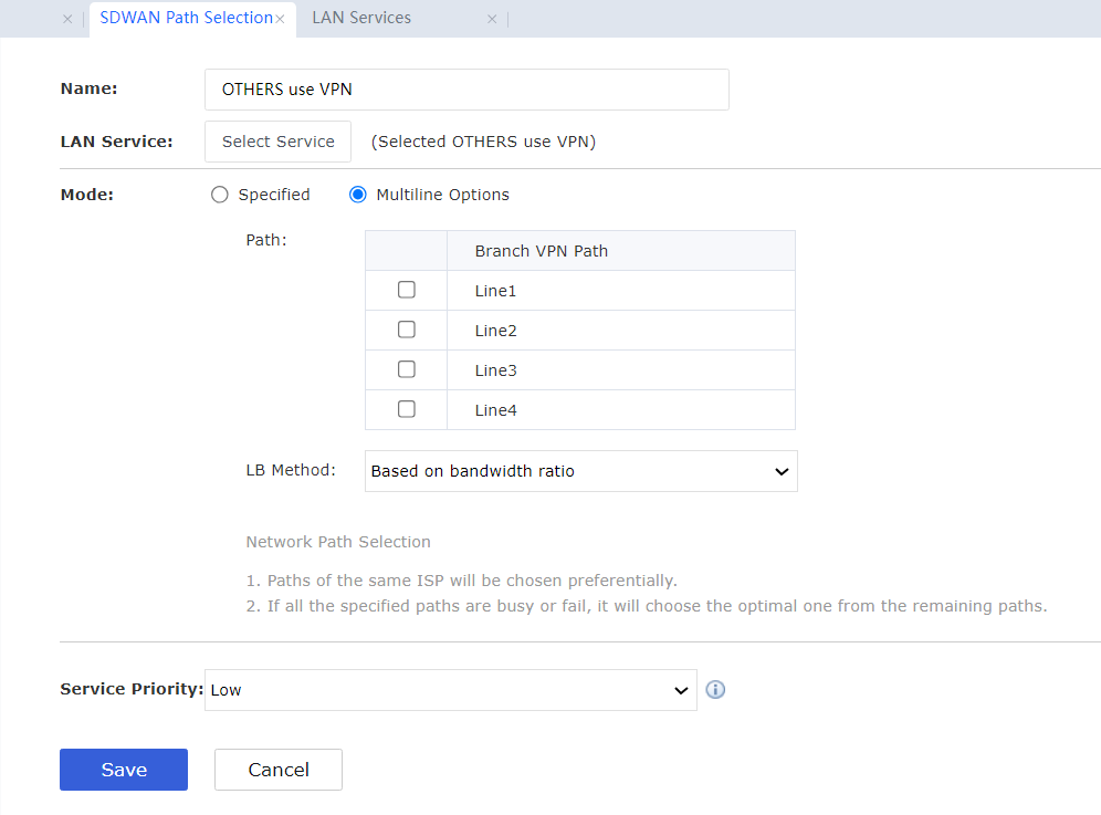 - Create an SDWAN policy OTHERS use VPN, select the current branch, and select All Services for LAN Service, Multiline Options for the mode, two lines of the branch for the load path, Based on bandwidth ratio for the LB Method, and Low for Service Priority.