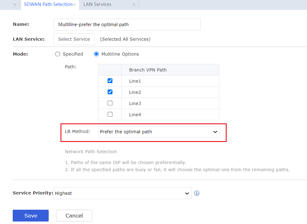 - Create an SDWAN policy; select all services for the service, Multiline Options for the mode, two lines of the branch for the load path, and Prefer the optimal path for the LB Method.