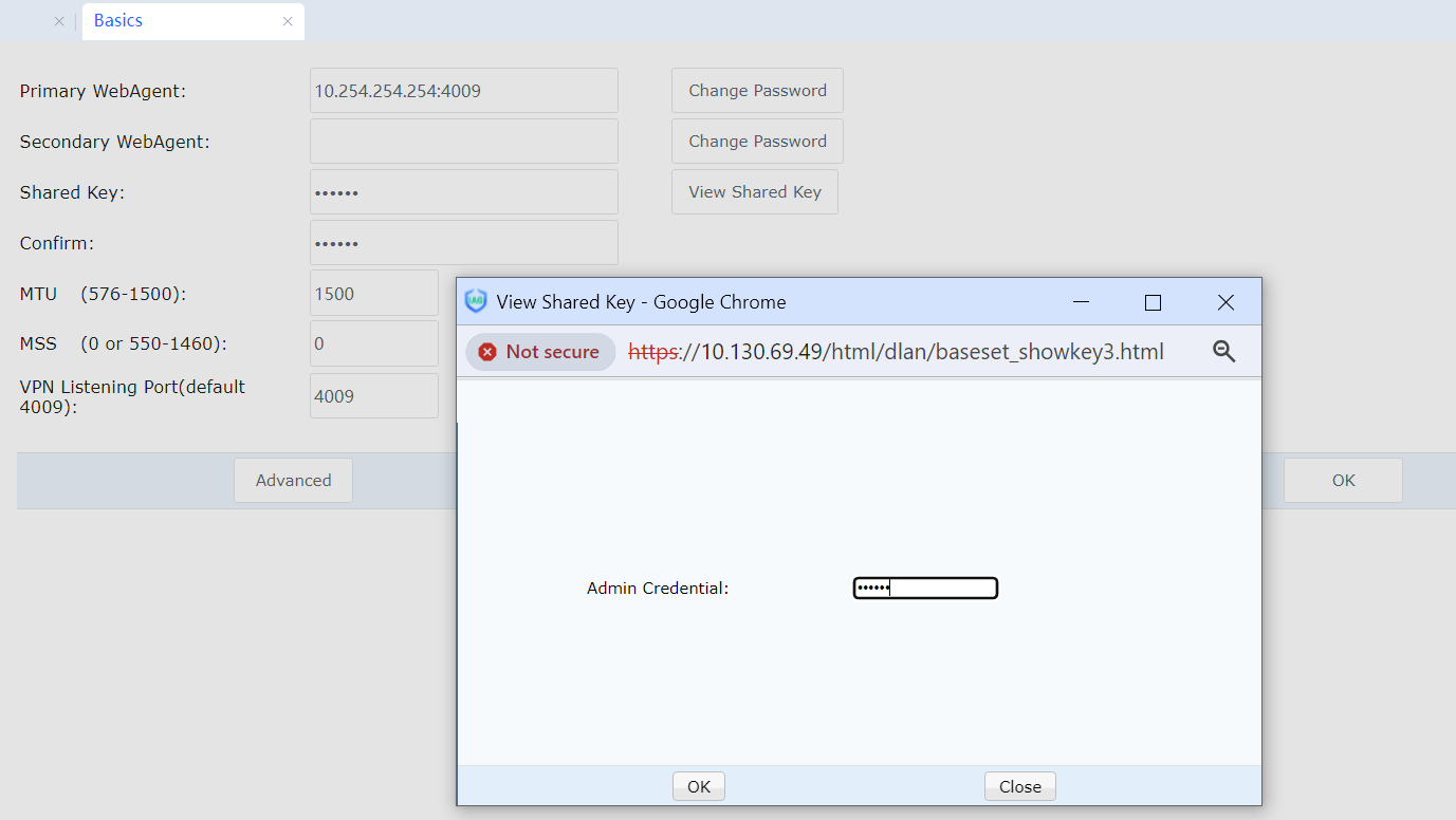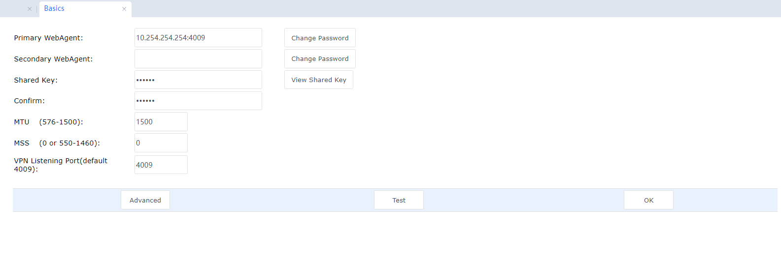 If WebAgent Password is set, it cannot be recovered once it is lost, and you have to contact the customer service center of Sangfor to regenerate a file excluding the WebAgent password and replace the original file. If Shared Key is set, all VPN sites cannot be interconnected until they must set the same Shared Key. With multiple lines and fixed IPs, WebAgent can be filled in the IP1 # IP2: Port format.