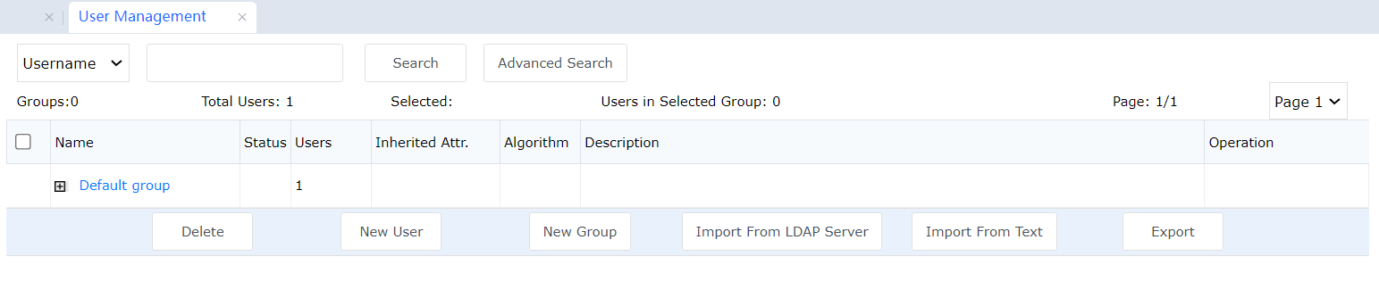 You can click Advanced Search and set filters for searching for users. You can select the username fuzzy match option. (If it is not selected, an exact keyword match is implemented. Separate keywords using a comma.) The search result includes the following information: user group, group attribute (unlimited, enabled, or disabled), status (unlimited, enabled, or disabled), type (unlimited, mobile, or branch), DKEY status (unlimited, enabled, or disabled), and user idleness duration (unlimited, one year, one month, one week, or user-defined). See the following figure.