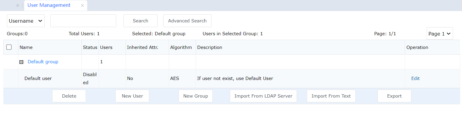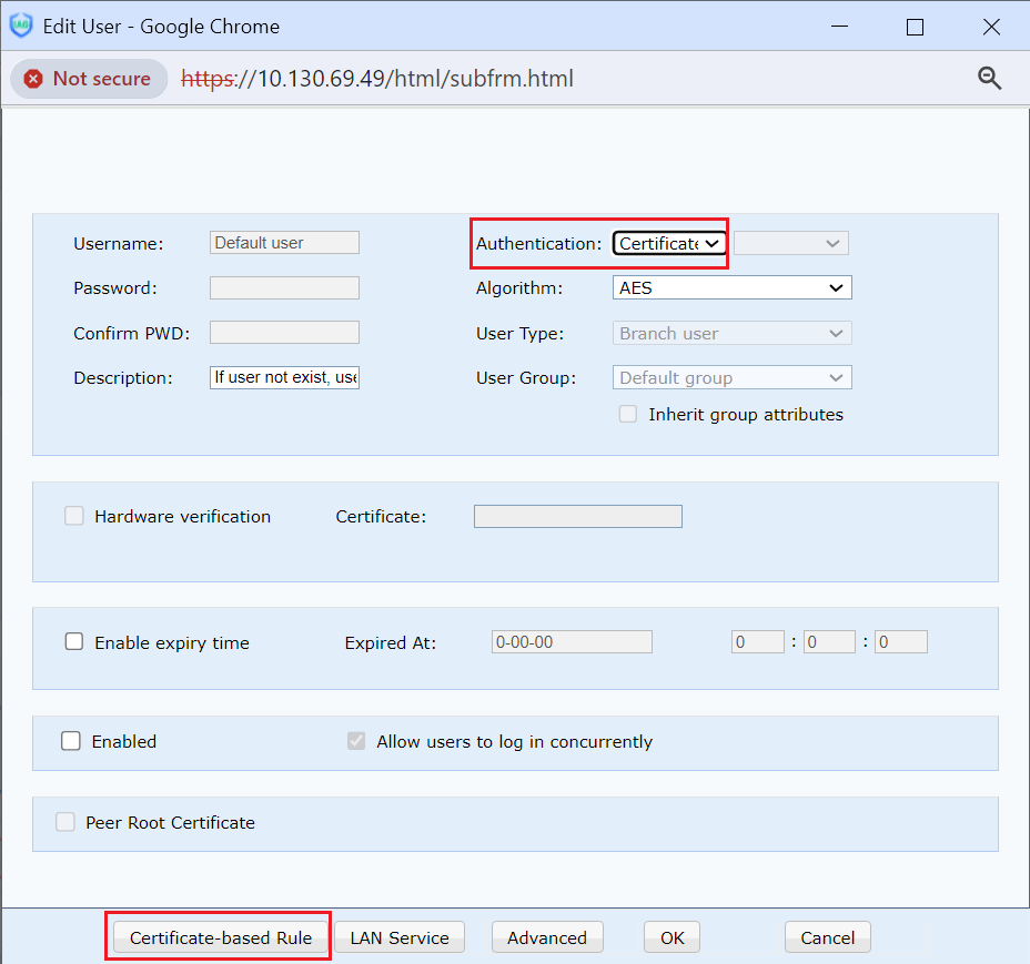 Default User: This will be matched if the user cannot be found in the user list and the authentication method is consistent with the default user. In addition, when there are multiple sites of certificate authentication in LAN, the default user is enabled and selected as certificate authentication, and the corresponding rules are configured. Therefore, it is unnecessary to add certificate authentication users to the user list one by one. The default user with the authentication enabled is configured as follows: