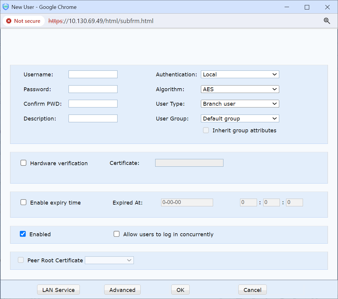 Authentication: Set user authentication types, including local authentication (i.e., hardware device authentication), LDAP authentication, RADIUS authentication, and certificate authentication.
