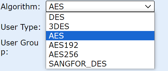 Algorithm: You can select from the DES, 3DES, AES, SANGFOR_DES, AES192, and AES256. Two peers must use the same algorithm.