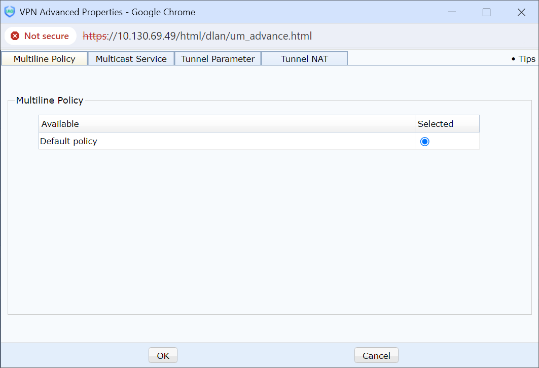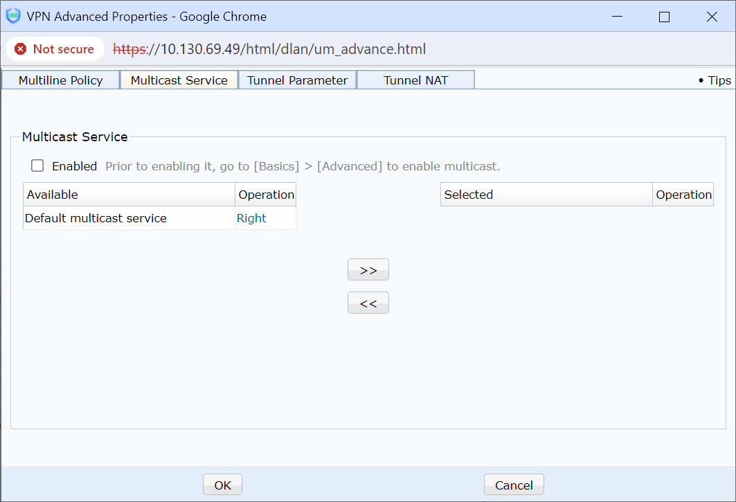 Advanced: Configure advanced attributes applicable to users connected to a VPN, including route selection policy settings, multicast service settings, channel parameter settings, and intra-channel NAT settings. Route selection policy settings are configured to dynamically select the optimal transmission line among multiple lines based on line conditions. Multicast service settings are configured to support the applications such as video applications that use the multicast protocol between servers and branches. Channel parameter settings are configured to control the traffic of branch VPNs. Intra-channel NAT settings are configured to handle the address conflict between two branches when they belong to the same intranet segment and are connected to a server. The following figure shows the configuration page.
