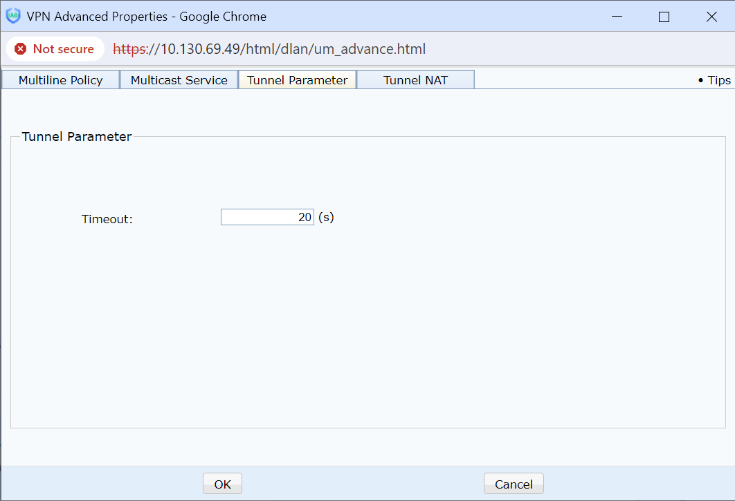 Timeout: When the network has a significant delay and high packet loss rate, you can set a timeout interval on a Sangfor VPN for the network. The timeout interval of each channel depends on the server configuration. The default timeout interval is 20s. For a poor network environment, you can increase the timeout interval.