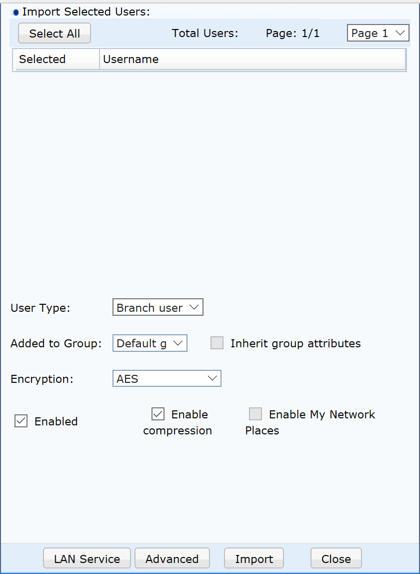Check the users to be imported, select the user type, including mobile user or branch user, a user group, encryption algorithm, compression, and network neighborhood, and then click Import to import users from the LDAP server into the VPN device.
