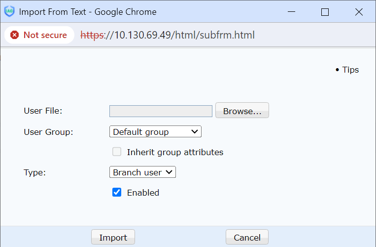 Click Import From Text to import user information from TXT or CSV files. You can choose to import users into a user group and use group properties. You can also set whether the imported user type is mobile or site. TXT file is formatted as username, password, and other users information that cannot be imported. CSV file is formatted the same as TXT files. Replace the English comma with an empty column. The page is as follows: