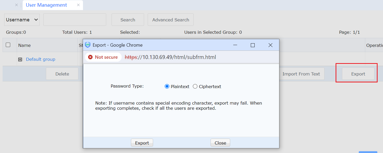 Click Export to export the user from the device to local for saving. You can choose whether the exported user password is encrypted or unencrypted. The page is as follows:
