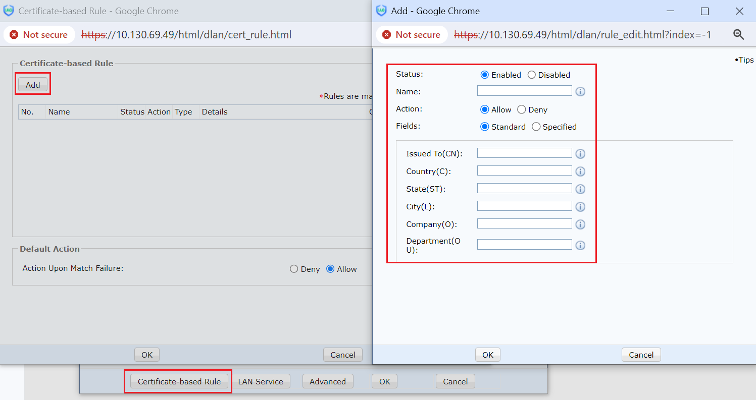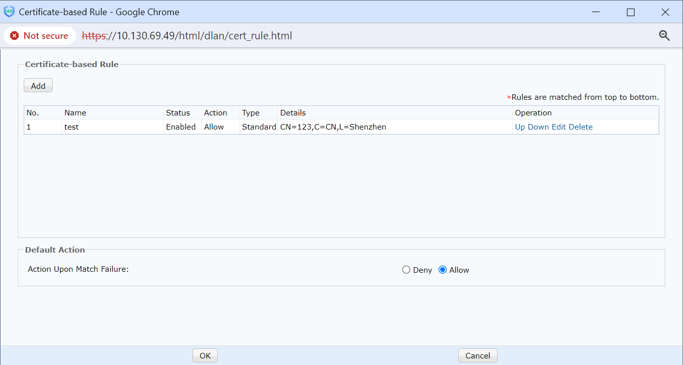 As shown in the above figure, certificate authentication rules are an additional function compared with ordinary users, and the certificate authentication rules can be configured. According to the rules, the peer certificate can be resolved for rule matching. When the matching fails, the default action will be enabled.