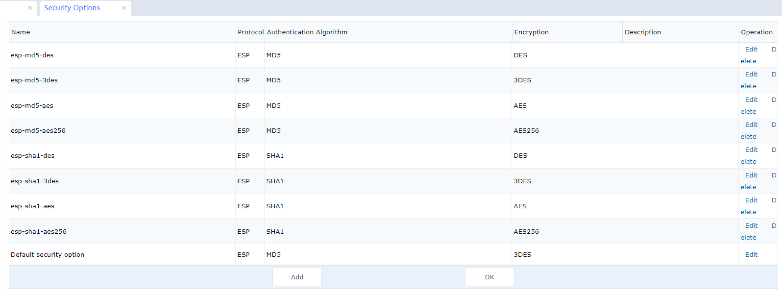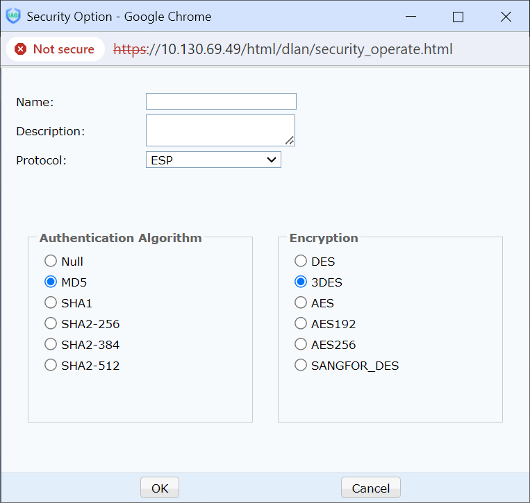 The encryption algorithm specified in the security options encrypts the data used in phase II of a standard IPSec connection. If multiple devices using different connection policies are interconnected, add the policies to the security options.